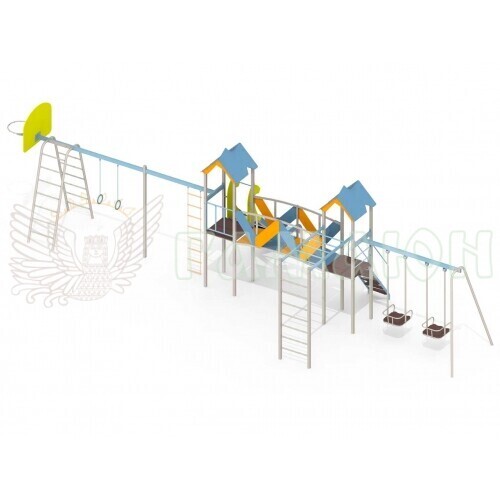 Складається з: Майданчик з дахом 2 шт., Гірка 1 шт., Сходи 1 шт., Огорожа 1шт., Рукохід 1 шт., Шведська стінка 3 шт., Гойдалки подвійні 1 шт., Гімнастичні кільця 1 к-т., Баскетбольне кільце 1 шт., Сходи мотузкові 1 шт., Місток 1 шт.