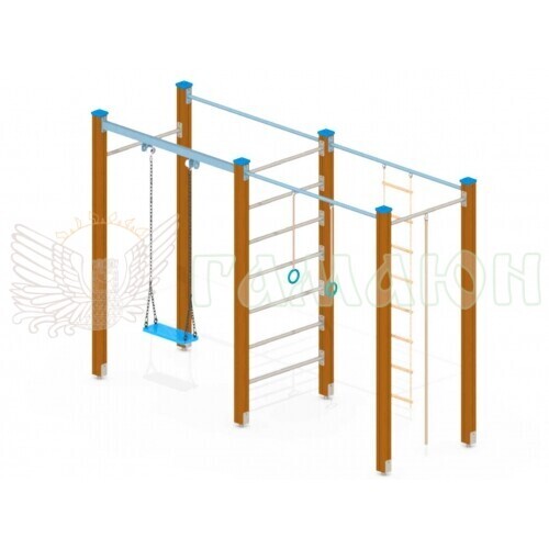 Вона складається з: Мотузкові сходи 1 шт., Перекладина 2 шт., Кільця гімнастичні 1 к-т., Канат 1 шт., Гойдалка на ланцюгах 1шт., Шведська стінка 1 к-т.