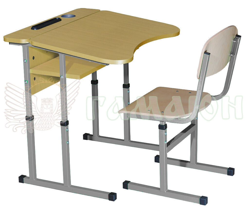 Стіл складається з стільниці ергономічної форми (закруглені кути з 4-х сторін), полиці та екрану між металевими каркасами. На боковій стійці каркасу закріплений гачок. Стільниця столу складається з двох частин. Та частина стільниці що знаходиться із сторони сидячого розміщена під кутом 7°. Інша частина стільниці знаходиться в горизонтальному положенні. Стільниця містить отвір для стакану з канцелярським приладдям, та пенал. Деревинні деталі стола виготовлені з ДСП ламінованої, товщиною 18 мм та 16 мм. Крайки всіх деревинних елементів личкуються матеріалом для крайок – ПВХ: Металеві частини стола учнівського виготовлені з квадратної труби 25х25х1,2 мм і 20х20х1,2 мм та мають захисне декоративне покриття – емаль порошкова. Регулювання висоти столу здійснюється за допомогою гвинтів по отворах каркасу і ніжки, між якими встановлена пластикова перехідна втулка. На торцях каркасу закріплені пластикові наконечники, які запобігають травмуванню учнів та пошкодженню підлоги.