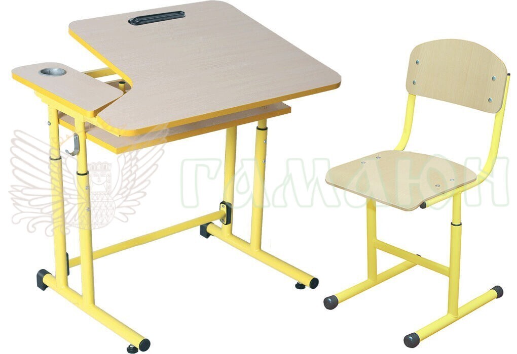 Стіл складається з стільниці ергономічної форми (закоруглені кути з усіх сторін) та металевого каркасу. На бокових поперечинах каркасу закріплені гачки. Стільниця столу складається з двох частин. Та частина стільниці що знаходиться із сторони сидячого може встановлюватися під кутом до 80 градусів. Інша частина стільниці постійно знаходиться в горизонтальному положенні та має виріз під стакан. На торцях каркасу закріплені пластикові наконечники, які запобігають травмуванню учнів та пошкодженню підлоги. Деревяні деталі столу виготовлені з ДСП товщиною 18 мм. Крайки всіх дерев&aposяних елементів личкуються матеріалом для крайок – ПВХ 1 мм. Каркас столу розбірний і виготовлений із сталевої круглої труби діаметром 32 мм і діаметром 25 мм, плоскоовальної труби 30х15 мм. Каркас має захисне декоративне покриття – емаль порошкова.