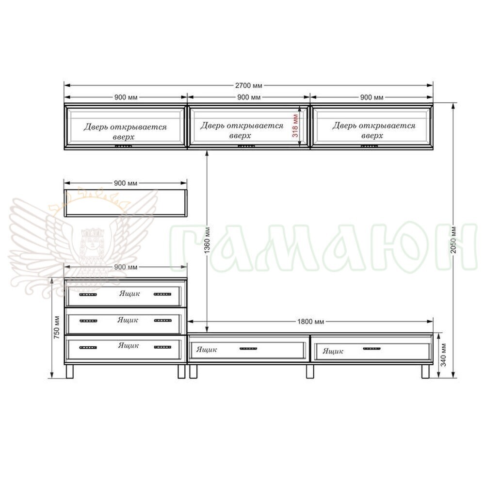 Ширина: 2700 мм. Глибина 450 мм. Висота 2050 мм. Вага 120 кг. Матеріал: ЛДСП 16 мм.
