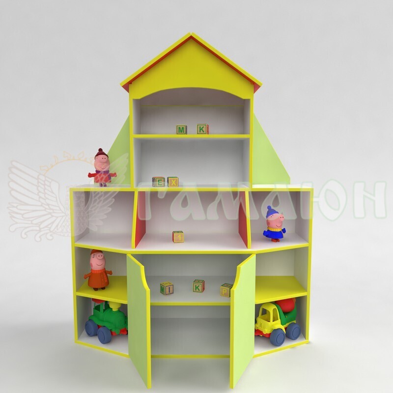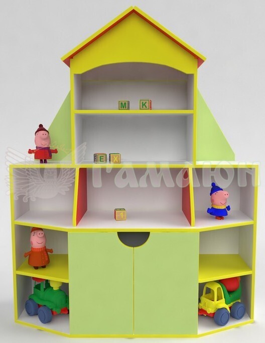 Дитяча стінка Книжковий будинок призначена для зберігання літератури, розвиваючих посібників, канцелярії.  Незважаючи на невеликі розміри, тут багато полиць різної величини. Багатофункціональні дитячі ігрові меблі допоможуть привчити малюків містити речі в порядку. Модель розрахована на середній і старший дошкільний вік. Можливо обирати дизайн в різних колірних модифікаціях.