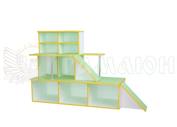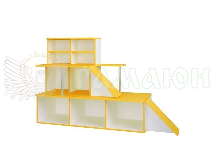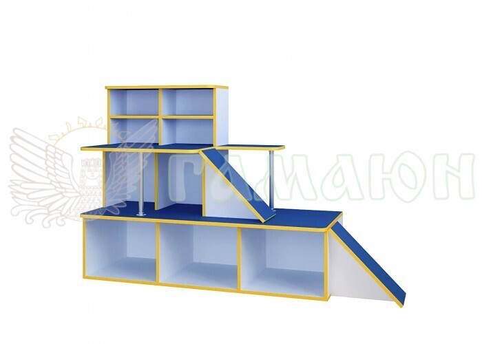Габаритні розміри (Ш×Г×В)1700*340*720ммІгрові меблі призначені для обладнання дитячого садка. Виготовлена ​​з екологічно чистої ДСП завтовшки 16 мм класу Е1, призначеної для виготовлення дитячих меблів. На торці нанесена кромка ПВХ товщиною 0,6 мм при високотемпературному режимі на кромкооблицювальному верстаті, що забезпечує максимальний захист країв від вологи та механічних пошкоджень. Базовий колір кромки – жовтий. Основні деталі корпусу за замовчуванням виготовлені із ламінованої ДСП білого кольору. Сині робили можуть бути замінені на ДСП червоного, зеленого чи жовтого кольору без подорожчання меблів. За бажанням дані кольору можна замінити будь-який інший колір ДСП. У цьому випадку вартість розраховуватиметься індивідуально. Усі матеріали підтверджені сертифікатом якості. Також у конструкції як стоїть використовується хромована труба ø25 мм, закріплена за допомогою спеціальних фланців.