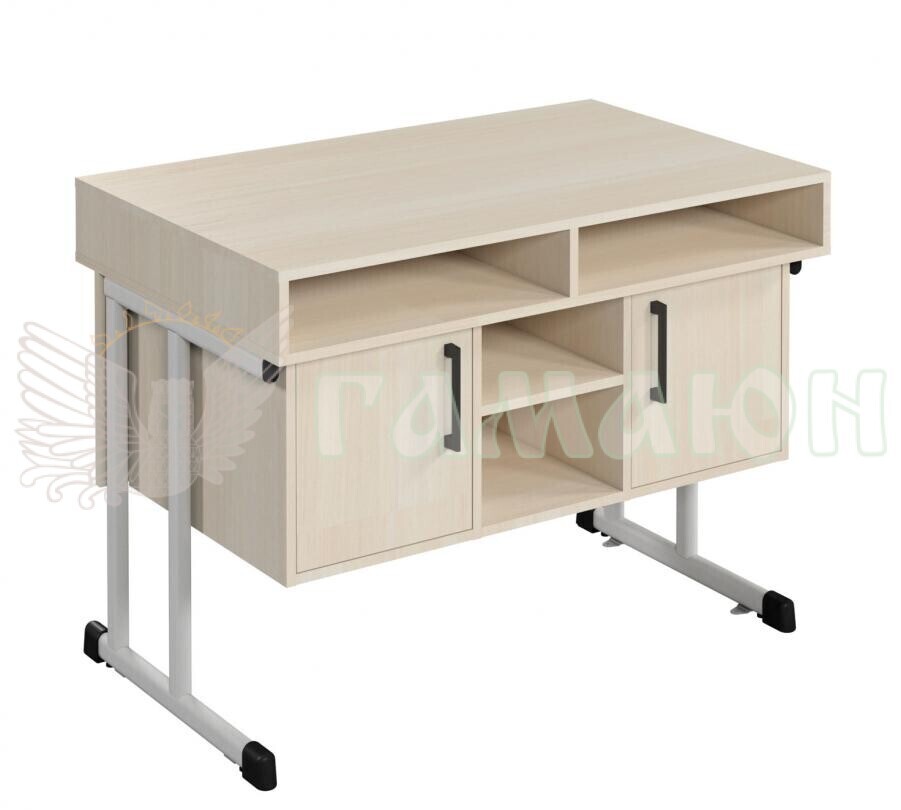 Стіл складається зі стільниці та підвісної тумби. Під стільницею розташовані дві ніші. Тумба має відкриту полицю з регулюванням та дві полиці з регулюванням, що закриті дверцятами.