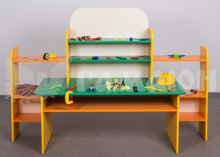 Ігрова зона “Майстерня” обовязково сподобається маленькм винахідникам, адже це безмежні можливість будувати, створювати та фантазувати. Полиці для зберігання іграшок та інструментів розташовані так, що малеча може самостійно діставати та складати необхідні речі та організовувати свій робочий простір.