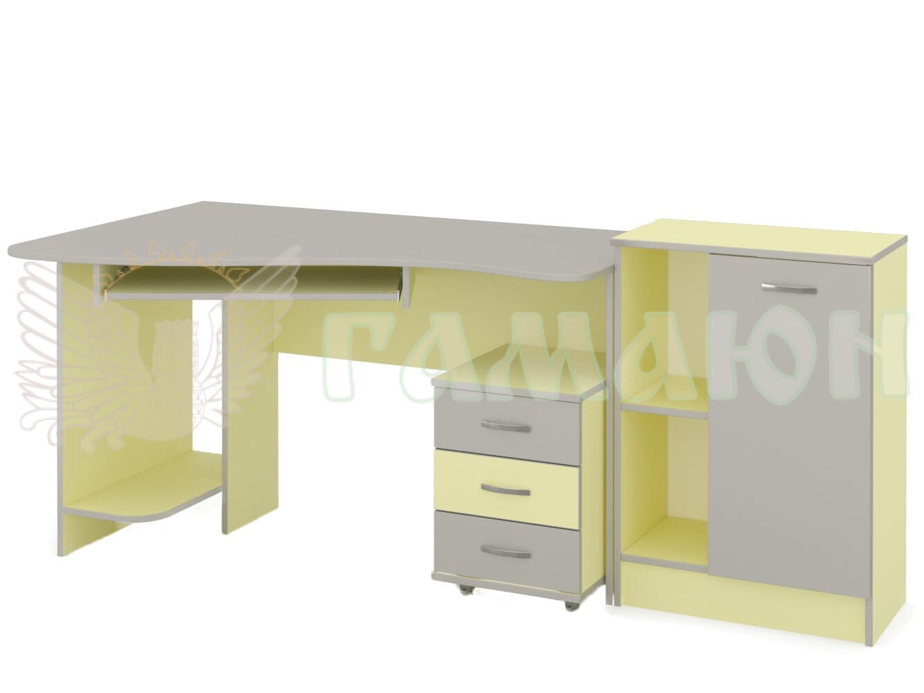 Стіл виготовляється з ламінованого ДСП товщиною 16 мм Корпус і фасад обклеюється кромкою ПВХ 0,5 мм, стільниця і кришка тумб ПВХ 2 мм. Роликові направляючі. Колір корпусу - як на фото. Можлива зміна кольорової палітри.