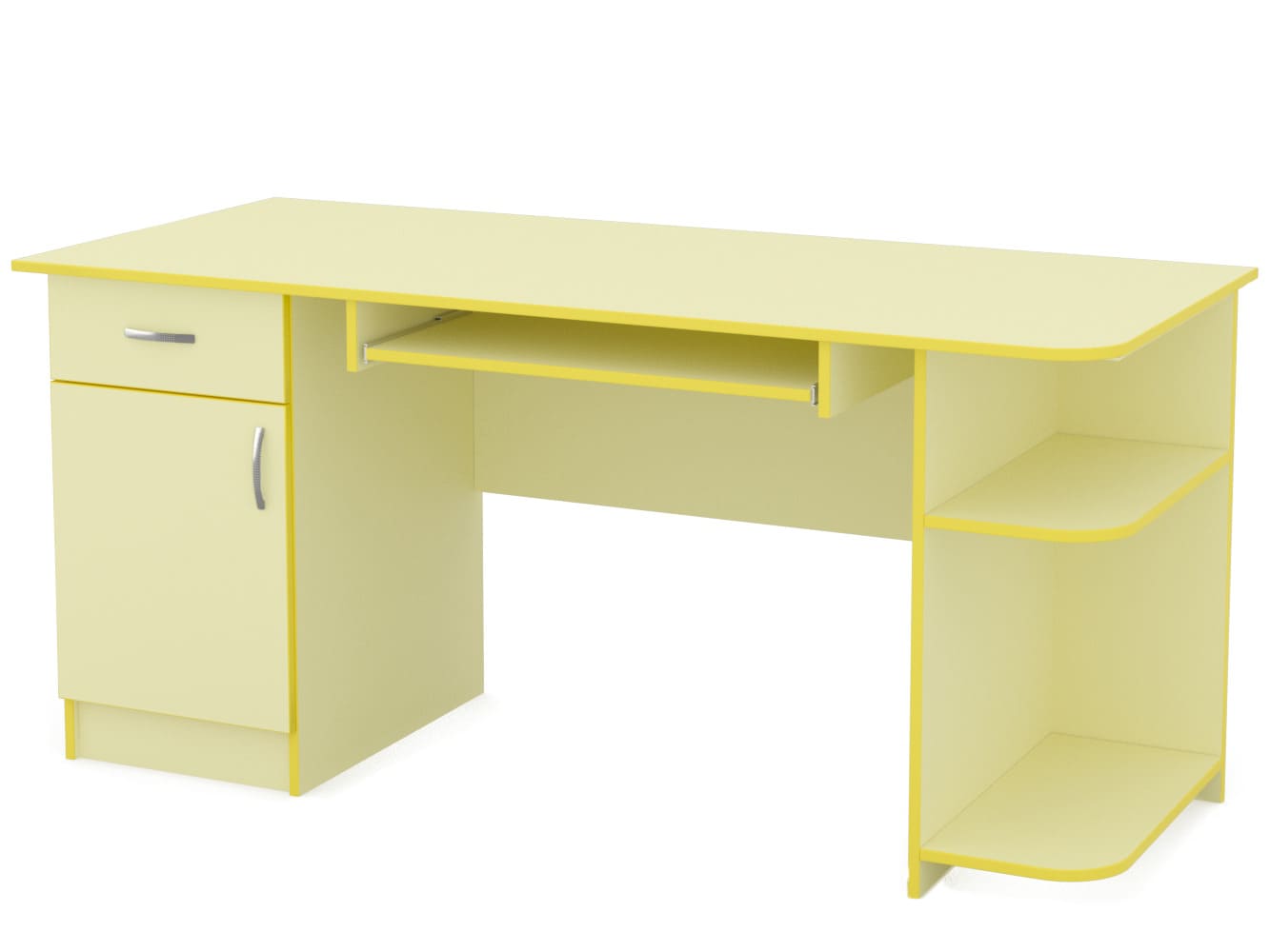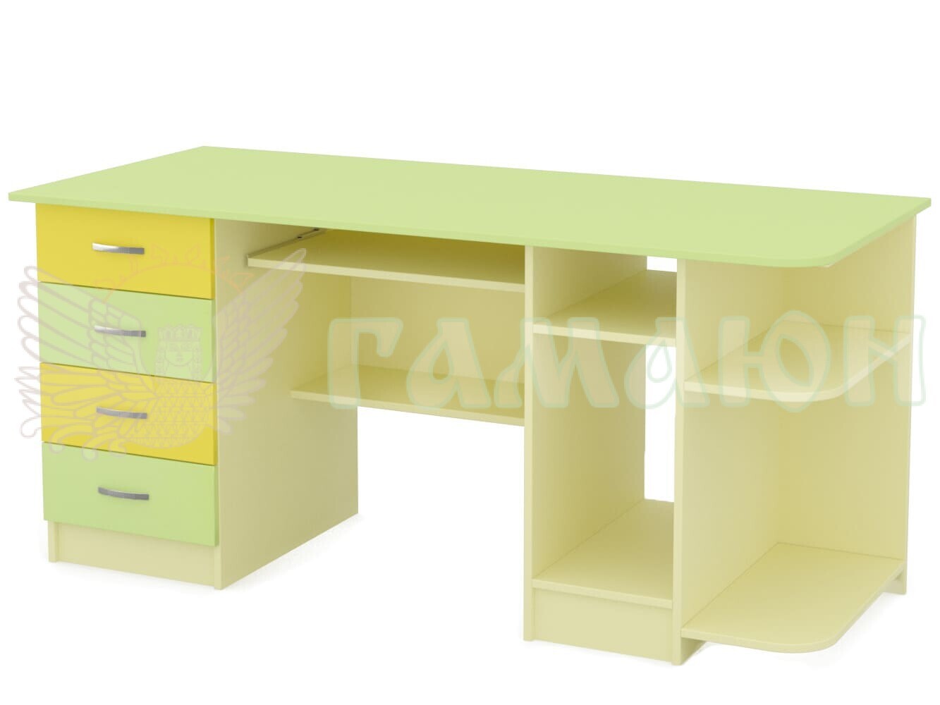 Стіл виготовляється з ламінованого ДСП товщиною 16 мм Корпус і фасад обклеюється кромкою ПВХ 0,5 мм, стільниця і кришка тумб ПВХ 2 мм. Роликові направляючі. Колір корпусу - як на фото. Можлива зміна кольорової палітри.