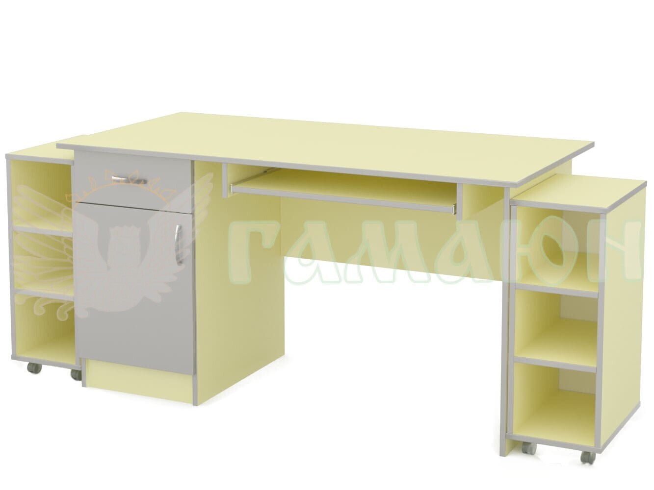Стіл виготовляється з ламінованого ДСП товщиною 16 мм Корпус і фасад обклеюється кромкою ПВХ 0,5 мм, стільниця і кришка тумб ПВХ 2 мм. Роликові направляючі. Колір корпусу - як на фото. Можлива зміна кольорової палітри.