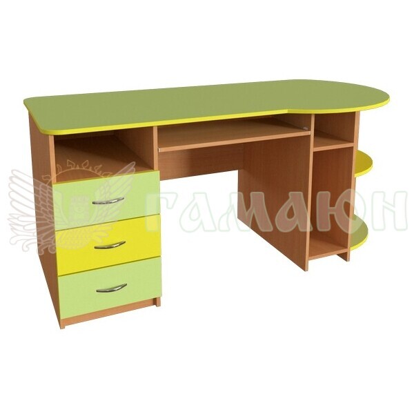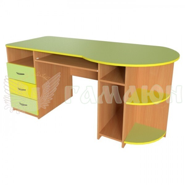 До комплектації входить: три висувних ящика і відкриті полиці, підставка під процесорний блок і полиця під клавіатуру - в цьому вчительському столі для комп'ютера є все необхідне для комфортної роботи викладача (при необхідності можна заказати надбудову). Можлива зміна кольорової палітри.