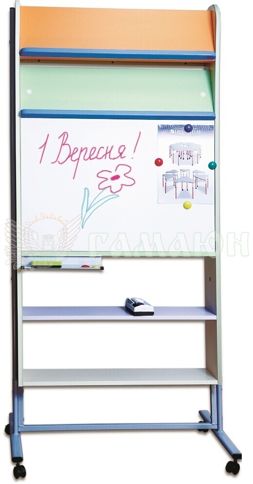 Стелаж двобічний складається: з металокаркасу на 4-х коліщатах; з двох бокових стінок з ДСП кольорового товщиною 16 мм, обклеєних по торцях протиударною кромкою ПВХ товщиною 2мм, що кріпляться до металокаркасу. Двох горизонтальних полиць, чотирьох похилих полиць розташованих під кутом з  підставками з деревини.  З однієї сторони розташована пробкова дошка для кріплення дидактичного матеріалу. З іншої сторони сталевий склоемалевий лист білого кольору для написання фломастером сухого стирання з полицею для письмового приладдя довжиною 25см. Металокаркас складається з двох стійок та ферми. Кінці труб закриті пластиковими заглушками. До металокаркасу закріплені коліщатка – (4шт.).