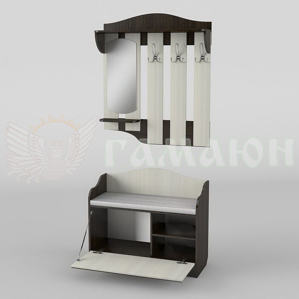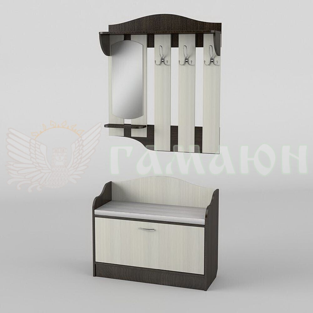 Передпокій-1 укомплектований тумбою для взуття з м'яким сидінням, відкритою вішалкою на три гачки, дзеркалом, горизонтальними полицями.