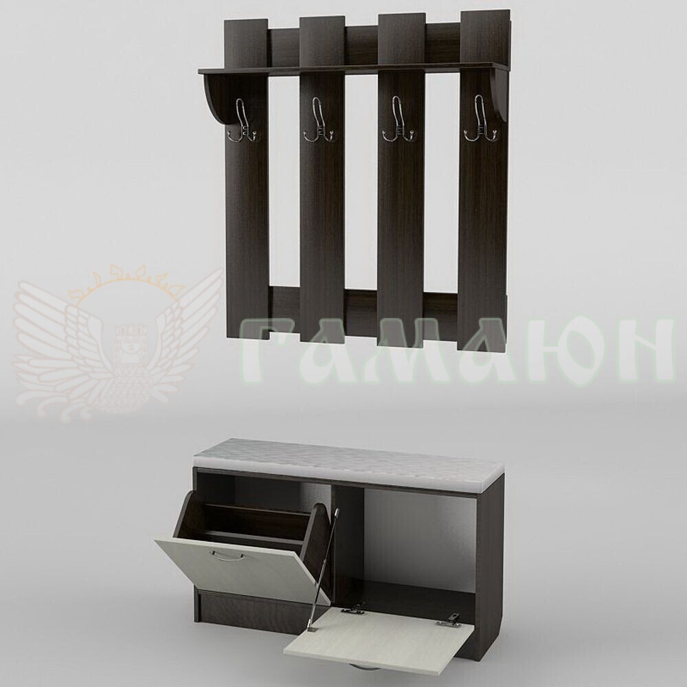 Передпокій-4 укомплектований тумбою для взуття з м'яким сидінням, відкритою вішалкою на три гачки, горизонтальною полицею.