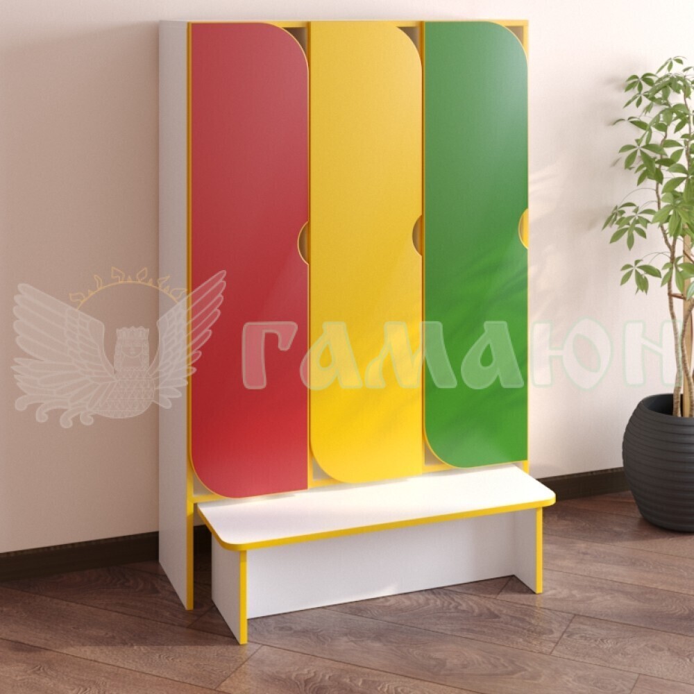 Шафа 3-х секційна з лавочкою для дитячого одягу чудово підходить для дитячих садків.