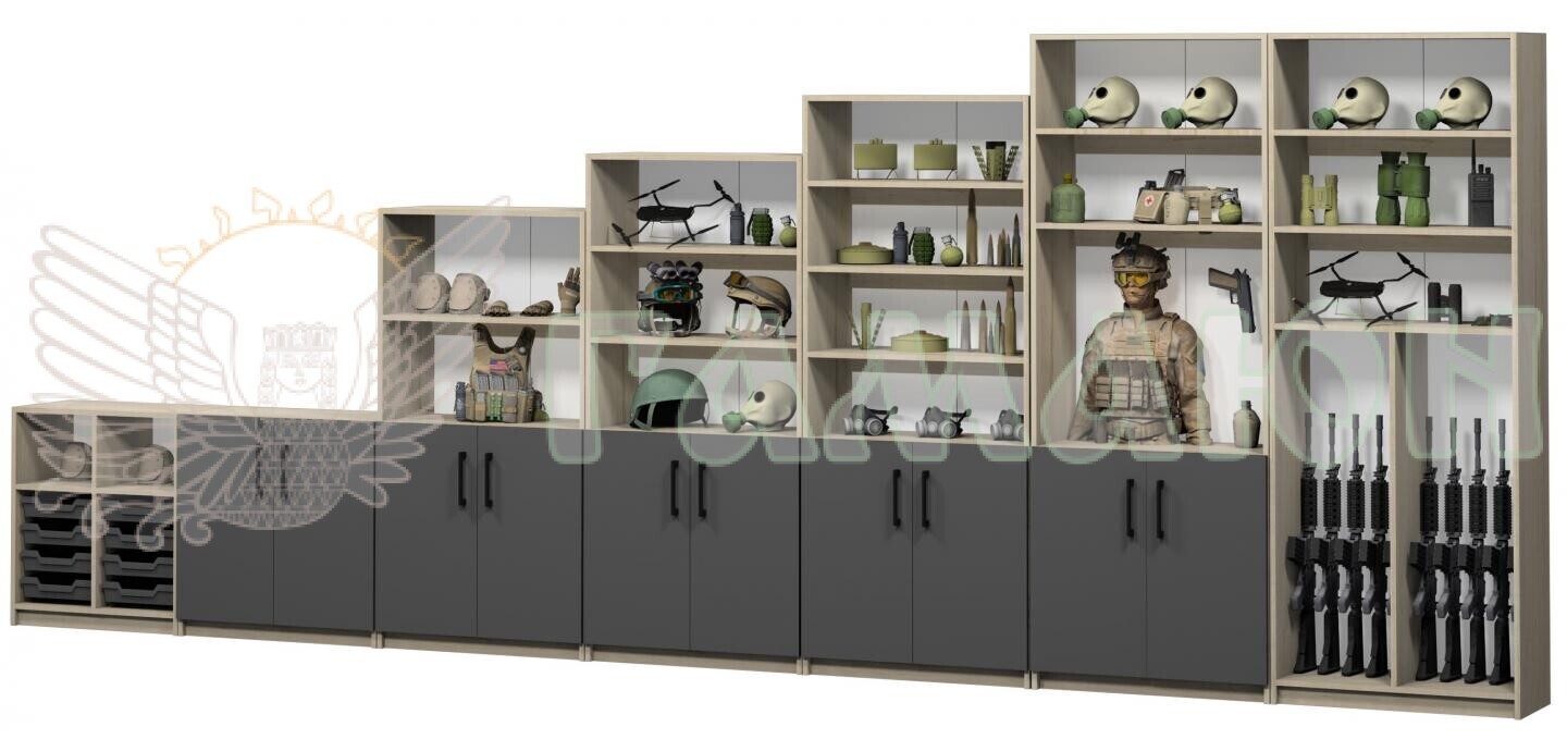 Стінка модульна для кабінету «Захист України» — це багатофункціональна система зберігання, призначена для організації простору в навчальних закладах, де викладається курс національного спротиву та безпеки.