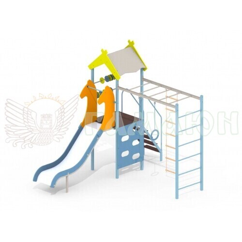 Складається з: Вежа з дахом 1 шт., Секція «Рукохід» 1шт., Шведська стінка 1шт., Канат 1шт., Гімнастичні кільця 1 шт., Гірка 1 шт., Сходи 1 шт., Дошка з вирізами 1 шт., Рахівниці 2 шт.