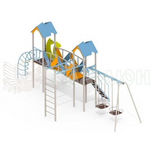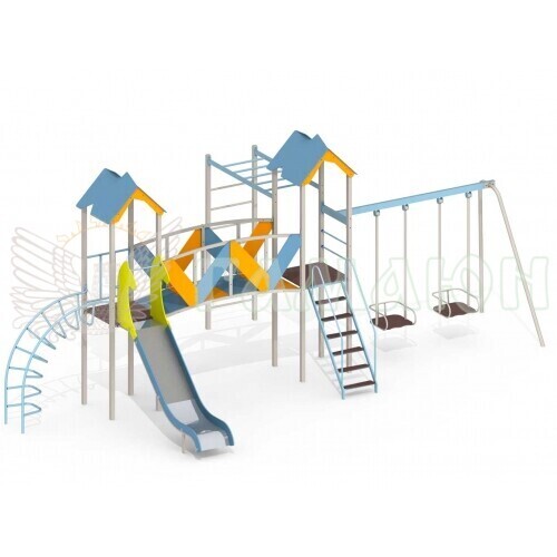 Складається з: Майданчик з дахом 2 шт., Гірка 1 шт., Сходи 1 шт., Дугові сходи 1 шт., Огорожа 1шт., Рукохід 1 шт., Шведська стінка 1 шт., Гойдалки подвійні 1 шт.