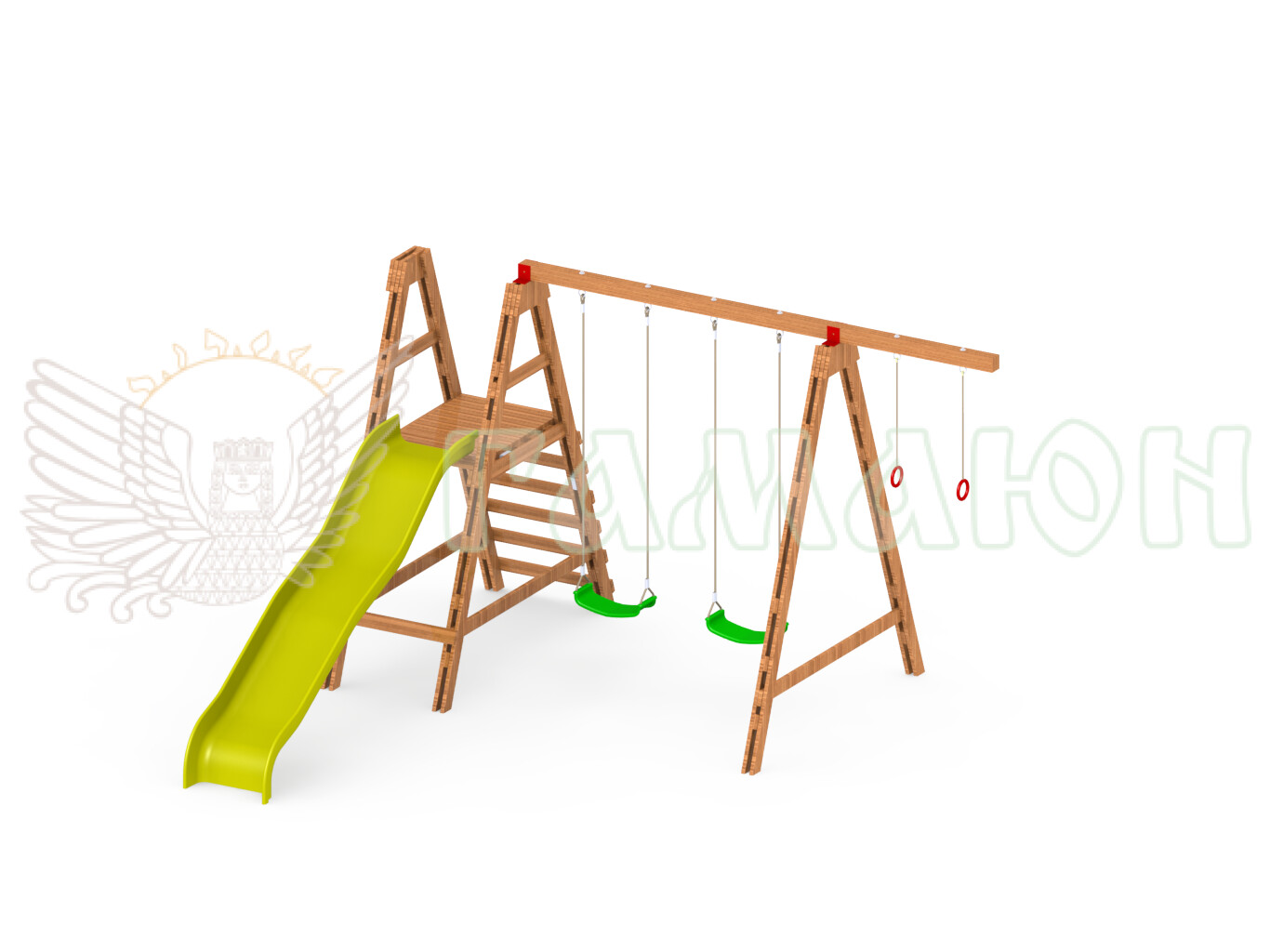 Складається з: Майданчик без даху 1 шт., Гірка 1 шт., Сходи 1 шт., Гойдалки 2 шт., Мотузяні кільця 1 к-т.