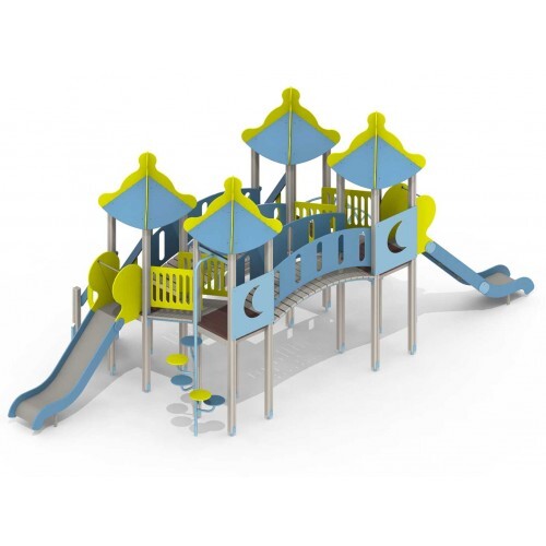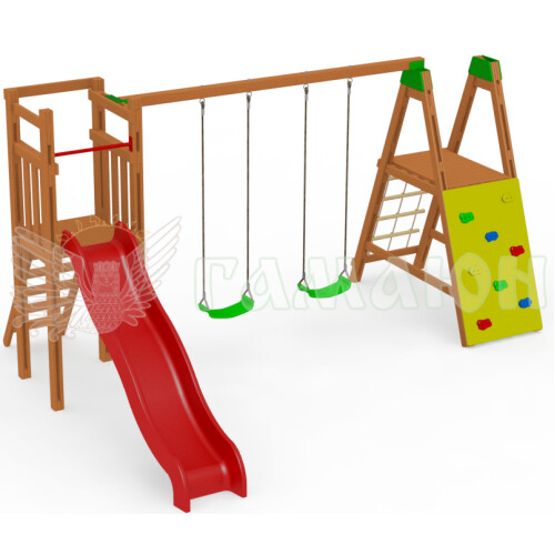 Дитячий ігровий комплекс призначений для розвиваючих ігор дітей у віці від 3 до 6 років. Дитяча гірка має захисну поперечину і бортики. Майданчики обладнані захисними перекладинами. Ігровий комплекс виготовлений з дерева. Має елегантний зовнішній вигляд.