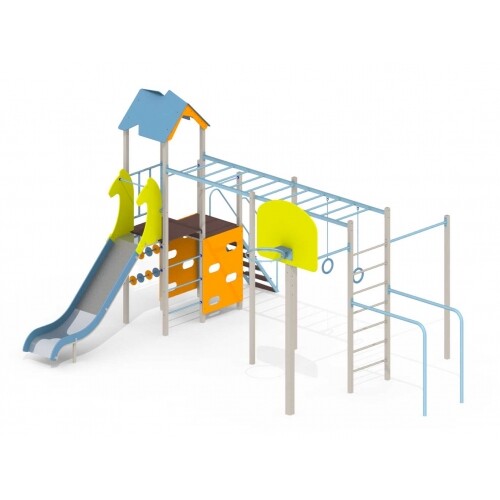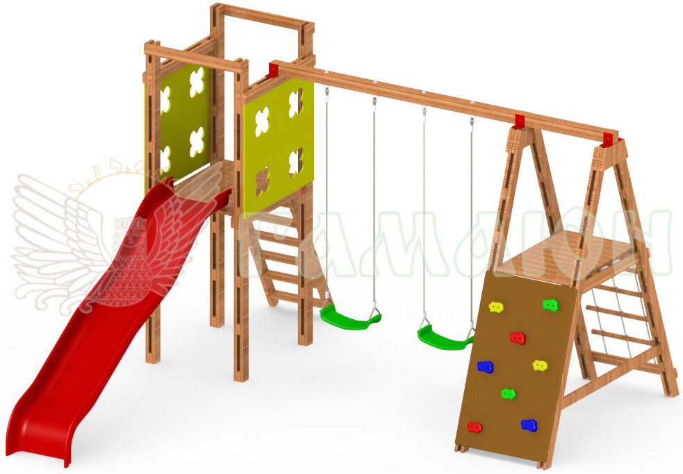 Складається з: Майданчик без даху 2 шт., Гірка 1 шт., Сходи 1 шт., Сходи для скелелазіння 2 шт., Гойдалки 2 шт., Дошка з вирізами 2 шт.