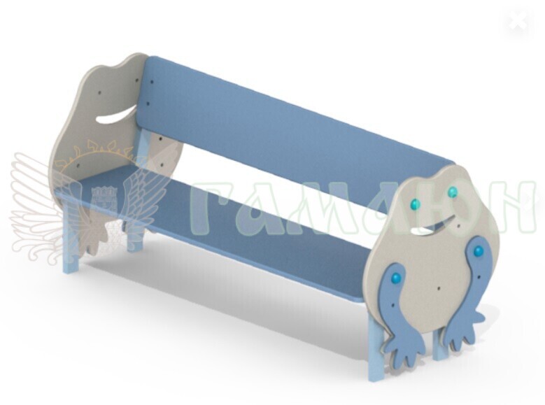 Лавочка призначена для відпочинку дітей і батьків під час гри на дитячому або спортивному майданчику. Сидіння виготовлено з дерева соснових порід, оброблених за технологією. Металевий каркас пофарбований поліефірною фарбою. Декоративний елемент «Жабеня» надає лавочки яскравості і казковості.