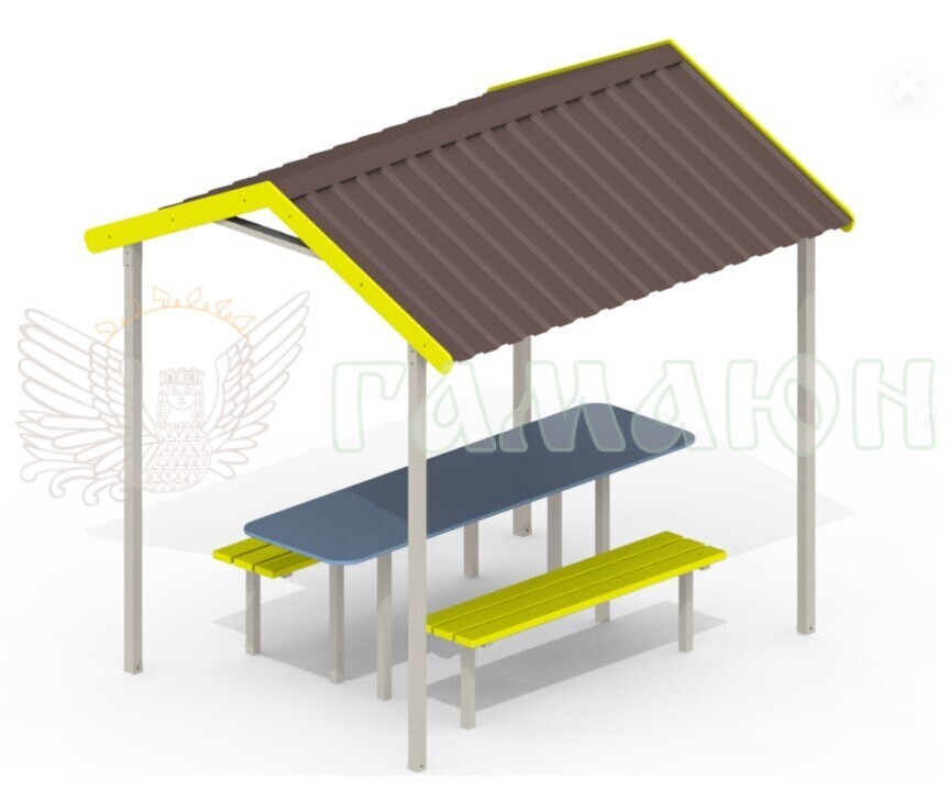 Складається з: Лавка 2 шт., Стіл 1 шт., Каркас 1 шт., Дах 1 шт.