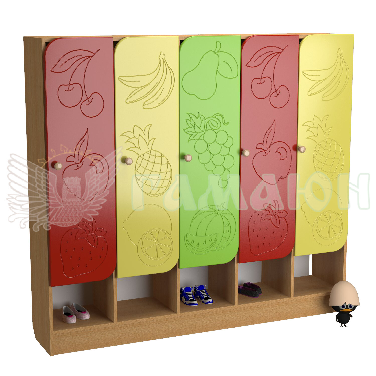 Компактна й функціональна шафа для роздягальні в дитячий садок «Фрукти» спеціально розроблена для облаштування роздягалень в дошкільних установах. На вибір представлені моделі шаф з різною кількістю секцій − 2, 3, 5. Це дозволить вам чітко облаштувати роздягальні дитячого садка.
