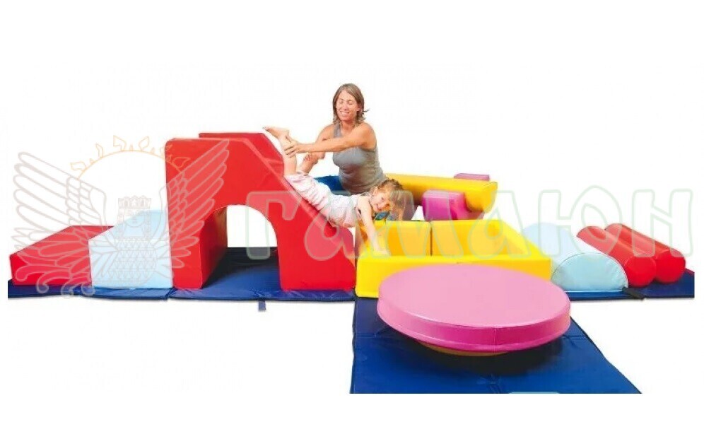 М'який модульний набір являє собою повноцінний комплект обладнання для ігрових кімнат і дитячих садів. Включає в себе 16 елементів і призначений для розвитку рухової активності, виконання гімнастичних занять, розвитку координації руху.
