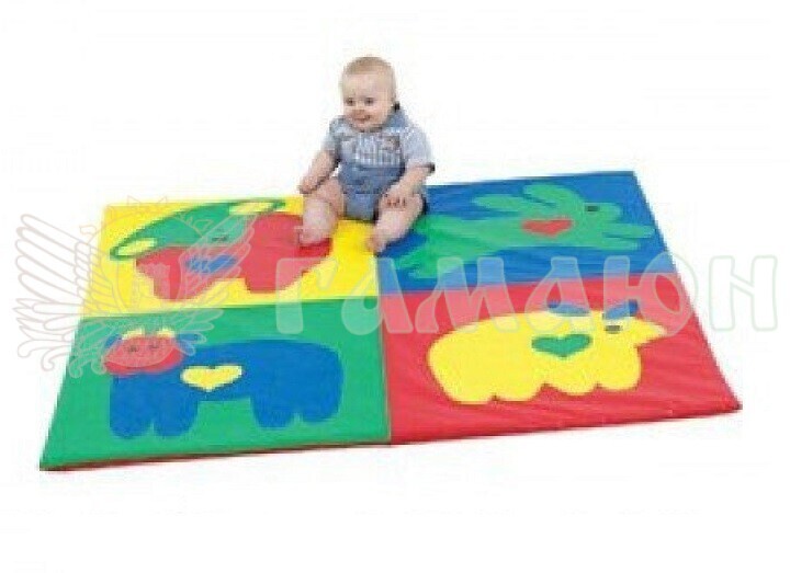 Дитячий мат можна використовувати як розвиваючі, навчальні ігри. Малюнок аплікація, мат складаний, розбірний на 4 частини, між собою з’єднується липучками, має зручну сумку для транспортування і зберігання, люверс для циркуляції повітря, міцний, м'який, компактний, має знімний чохол, легко миється і чиститься. Чохол – шкіряний замінник / ПВХ (під замовлення), пінополіуретан.