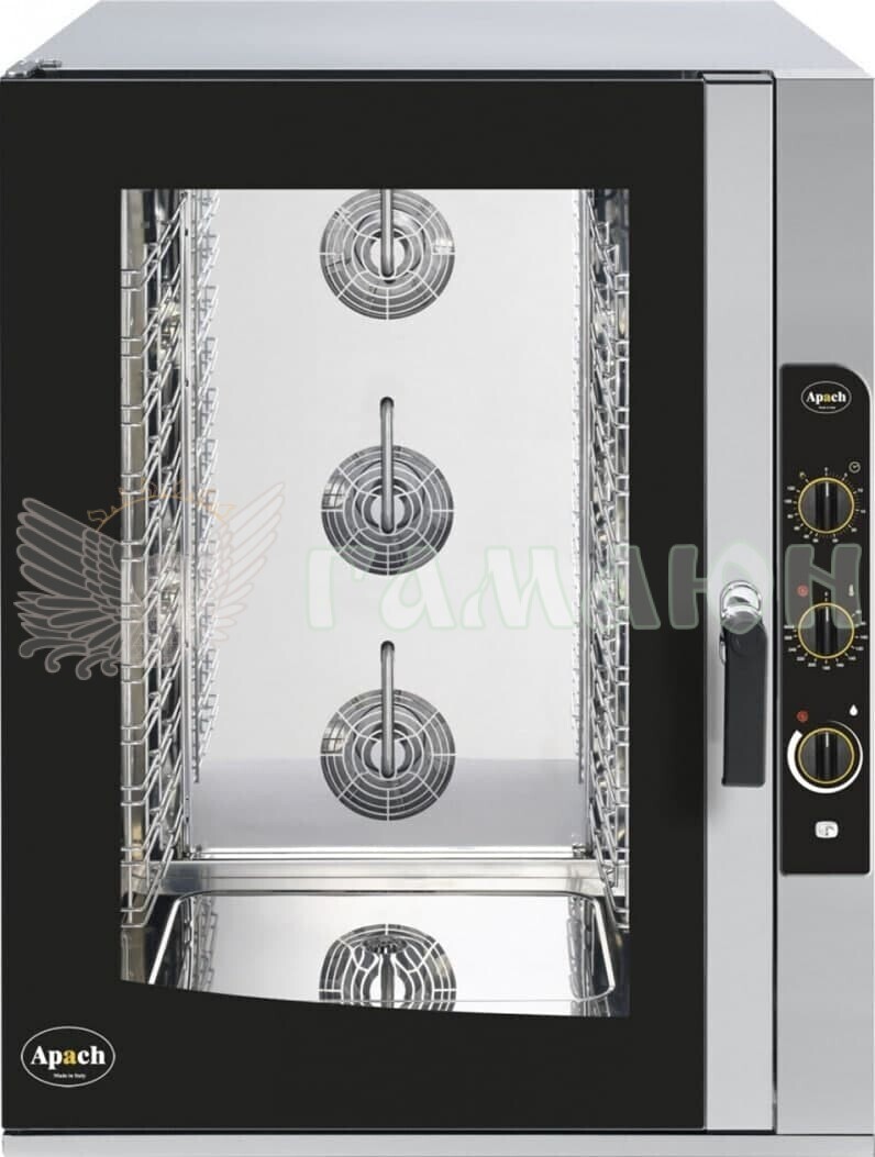 Пароконвектомат Apach AP10QM призначений для обсмажування, приготування на пару, бланшування, запікання та інших видів теплової обробки продуктів на підприємствах громадського харчування та торгівлі. Підсвічування камери здійснюється галогеновою лампою. Камера легко чиститься закругленими кутами. Корпус та камера виготовлені з нержавіючої сталі, дверцята - із подвійного загартованого скла. Система парозволоження інжекторного типу дозволяє генерувати пару відразу після включення обладнання за рахунок прямого впорскування води із системи водопостачання на нагрівальні елементи.