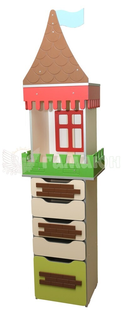 Матеріал: Корпус, полиці, дверцята: ДСП ламінована, товщина 16 мм. Задня стінка: ДВП ламінована 3 мм, фасад оклеєно крайковою стрічкою ПВХ - 1мм. Інші частини ПВХ - 0,5 мм. З оздобленням 10 мм МДФ фарбованою - коричневого, червоного, блакитного та зеленого кольорів.  В нижній частині елементу є висувний ящик на колесах.