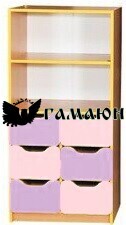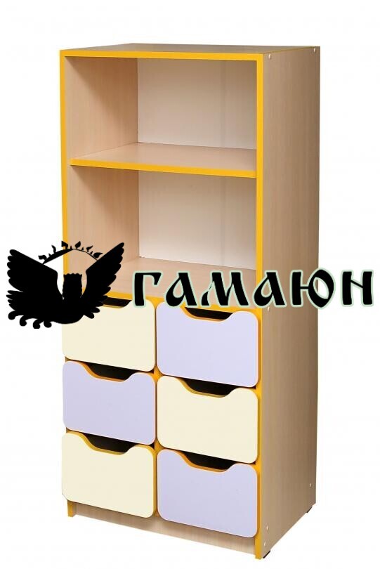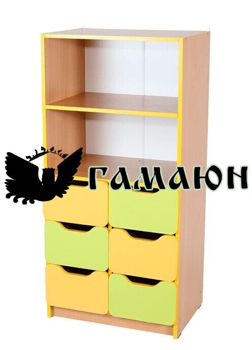 Стелаж з 6-ма шухлядами повного висування. Виготовлений з ДСП: корпус 16 мм, фасад 18 мм. Задня стінка виготовлена з білої ламінованої ДВП товщиною 3 мм.