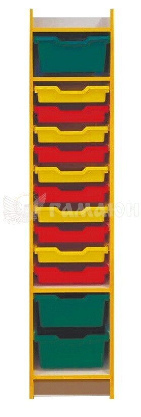 Шафа комплектується пластиковими лотками Gratnells розмірами 312х377х75 мм вагою до 520 грам кількість 10 штук та 312х377х150 мм вагою до 680 грам кількість 3 шт.
