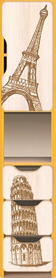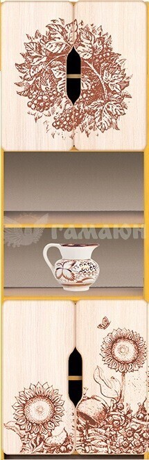 Шафа напівзакрита 4-дверна. Виготовлена з ламінованої ДСП: корпус 16 мм, фасад 18 мм. Задня стінка виготовлена з білої ламінованої ДВП товщиною 3 мм. Оклейка: ПВХ жовтого кольору товщиною 1 мм.