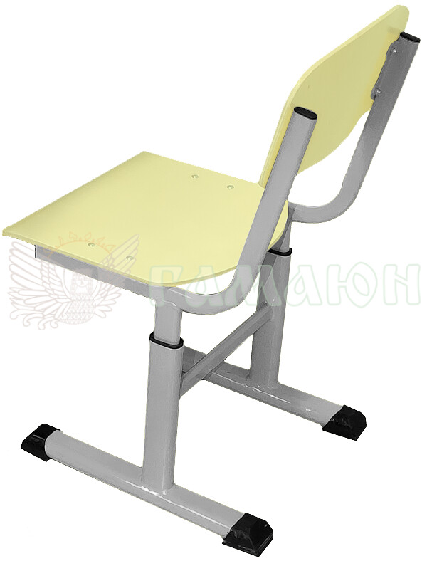 Технічні характеристики: Габаритні розміри — 391 × 485 × (740–860) мм Розміри сидіння — 380 × 350 мм Розміри спинки — 380 × 200 мм Каркас — плоскоовальна сталева труба: 30×15, 38×20, 50×30 мм; товщина стінки — 1,2 мм Покриття металу — порошкова емаль Сидіння та спинка — гнуто-клеєна фанера товщиною 8–9 мм з HPL-покриттям 0,4–0,5 мм Кріплення — гвинти Регулювання висоти — гвинтова стяжка з ковпачковою гайкою та пластиковою втулкою Маркування ростових груп — оглядовий отвір у нижній частині каркасу Захист підлоги — пластикові наконечники на торцях