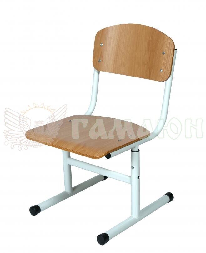 Технічні характеристики: Габаритні розміри — 385 × 435 × (700–820) мм. Вага виробу — 4,59 кг. Розміри сидіння — 380 × 350 мм. Розміри спинки — 380 × 200 мм. Каркас виготовлений із круглих сталевих труб діаметром 25 мм та 32 мм із порошковим фарбуванням. Сидіння та спинка — з гнуто-клеєної фанери 8–9 мм із HPL-покриттям завтовшки 0,4–0,5 мм. Усі краї заокруглені. Регулювання висоти здійснюється гвинтово-гаєчним з’єднанням із ковпачковою гайкою всередині труби. У місцях з’єднання встановлено внутрішні поліуретанові втулки для плавності регулювання й захисту. Кріплення дерев’яних елементів — болти грибоподібної форми з безпечними гайками. Наявне ростове маркування — як у вигляді кольорових кругів (~10 мм), так і шкала, нанесена лазерним гравіюванням на каркасі. На нижній частині каркасу — оглядовий отвір для контролю висоти. Торці каркасу оснащені пластиковими наконечниками.
