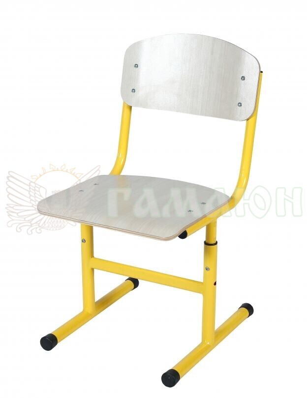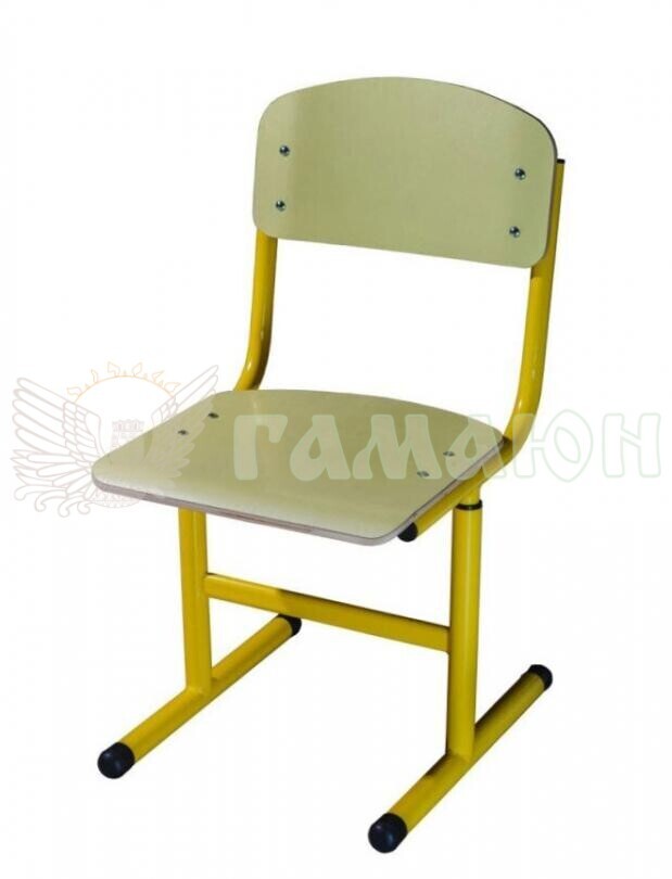 Опис виробу: Стілець призначений для обладнання навчальних приміщень, забезпечуючи правильну посадку учнів ростових груп №3–6. Конструкція базується на Т-подібному каркасі з круглої металевої труби та гнуто-клеєних дерев’яних елементів з HPL-покриттям. Сидіння й спинка мають округлені краї для безпеки користувачів. Регулювання висоти та нанесене ростове маркування дозволяють точно налаштувати стілець відповідно до зросту дитини.
