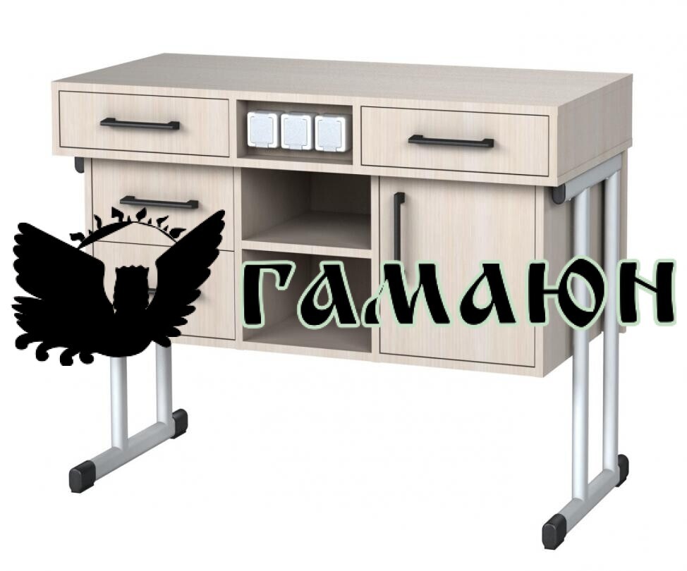 Опис виробу: Стіл використовується в кабінетах природничого профілю (фізика, хімія) для організації робочого місця учня або викладача. Конструкція передбачає наявність вбудованих розеток та кронштейна для підводу електричних дротів, що робить виріб придатним для виконання демонстрацій, дослідів або роботи з електрообладнанням. Робоча поверхня покрита пластиком HPL, стійким до хімічних речовин, вологи та механічного зносу.