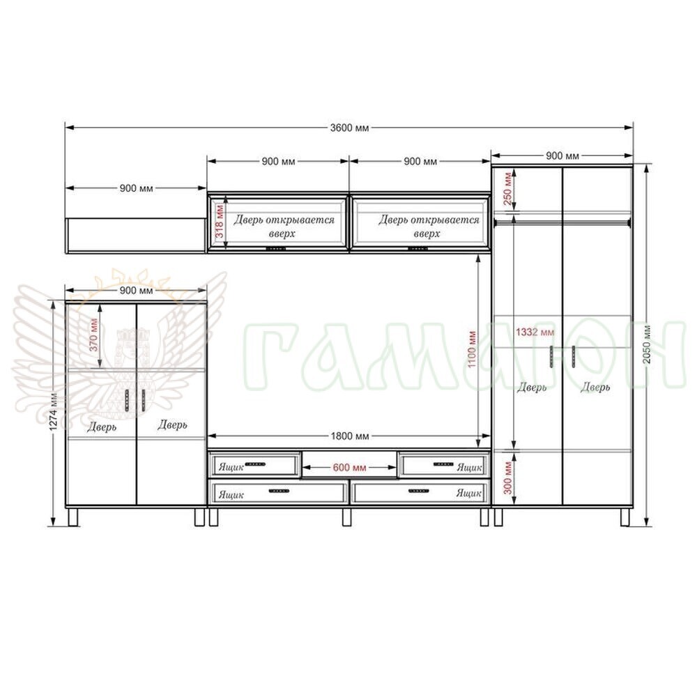 Ширина 3600 мм. Глибина 520 мм. Висота 2050 мм. Вага 175 кг. Матеріал: ЛДСП 16 мм.