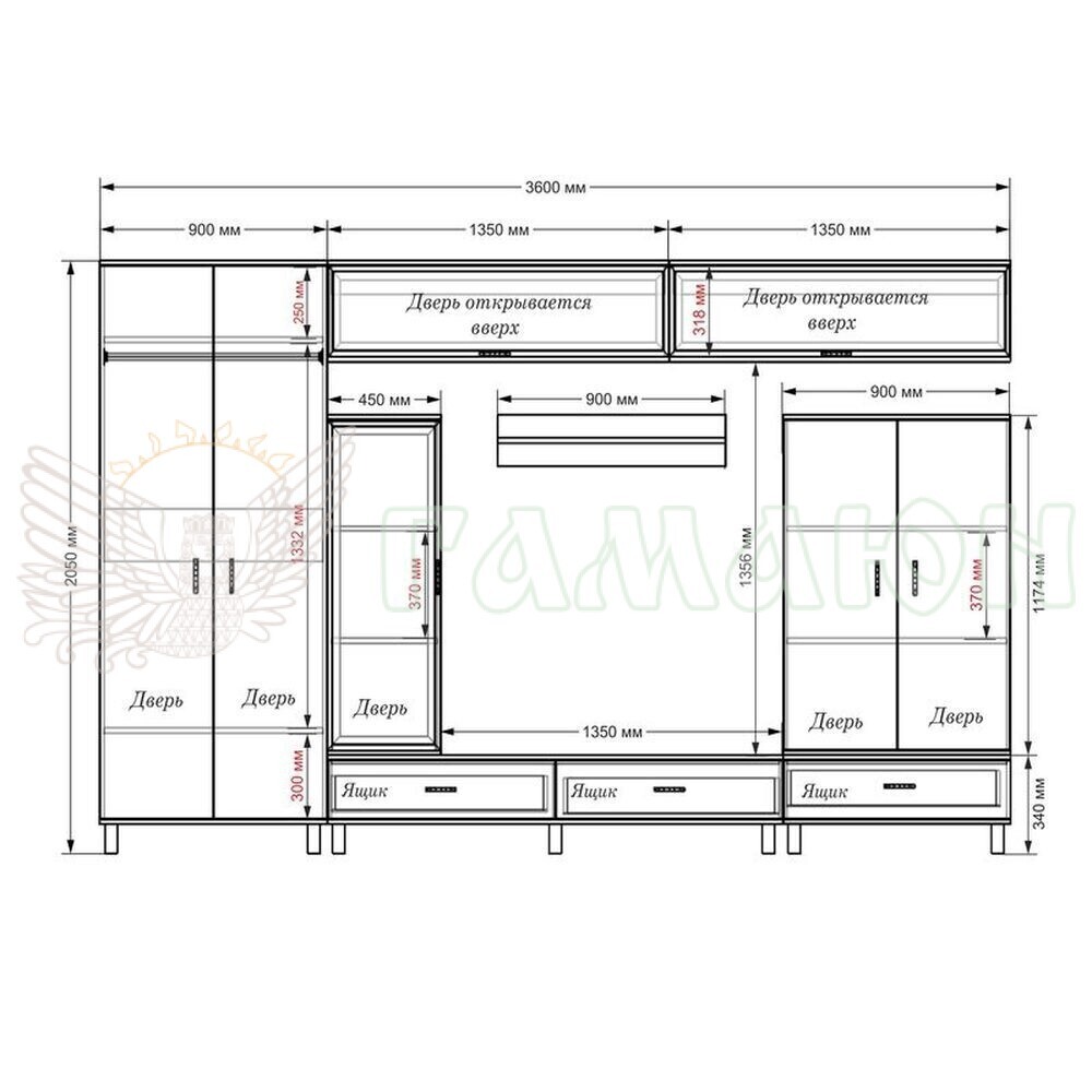 Ширина 3600 мм. Глибина 520 мм. Висота 2050 мм. Вага 175 кг. Матеріал: ЛДСП 16 мм.
