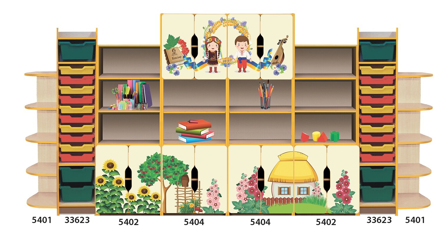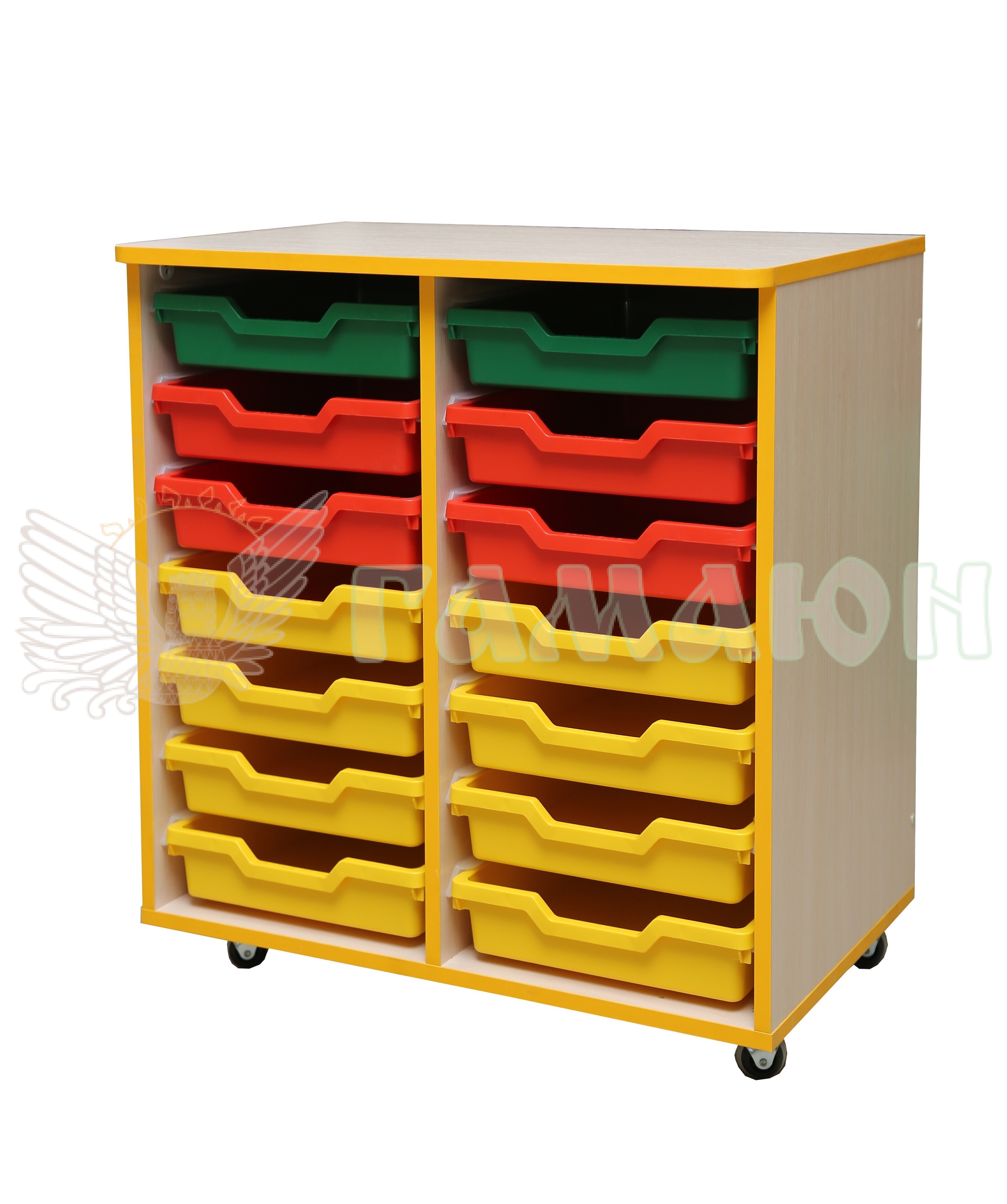 Елемент виготовлений з ламінованого ДСП 16 мм, комплектується пластиковими лотками Gratnells, які використовуються як для зберігання, так і для роздаткового матеріалу. Розмір лотків на вибір Замовника, можливі кольори лотків: жовтий, червоний або зелений. Елемент обладнаний колесами, що дозволяє легко переміщувати елемент для створення Нового освітнього простору.