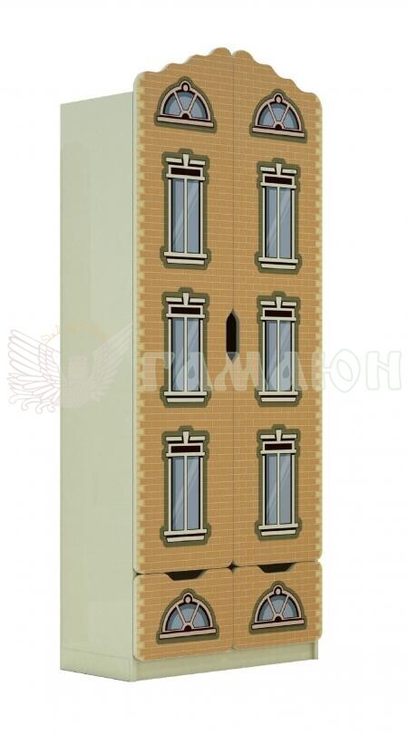 Шафа розділена на дві частини: відділення для верхнього одягу з гачками та відділення з полицями. Також шафа має дві шухляди на напрямних повного видвигу.