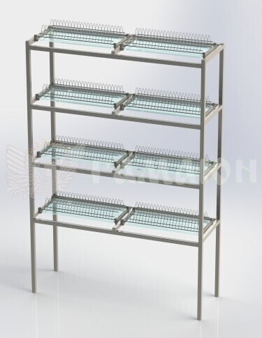 Стелаж з хрому, для сушки посуду, служить для зручного підсушування помитого посуду і короткочасного його зберігання. 2 полиці для тарілок, 2 полиці для стаканів.