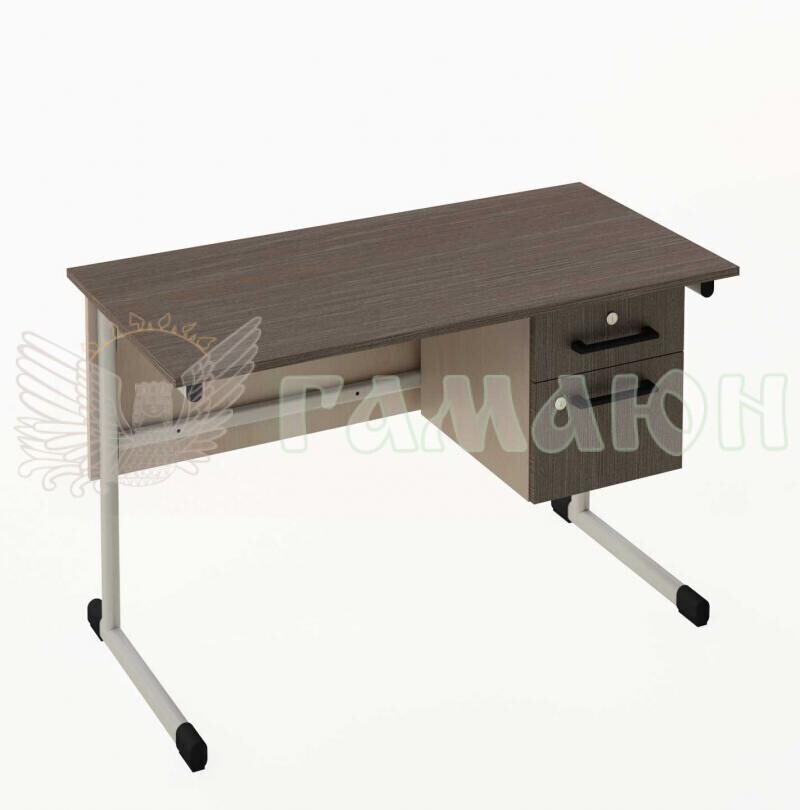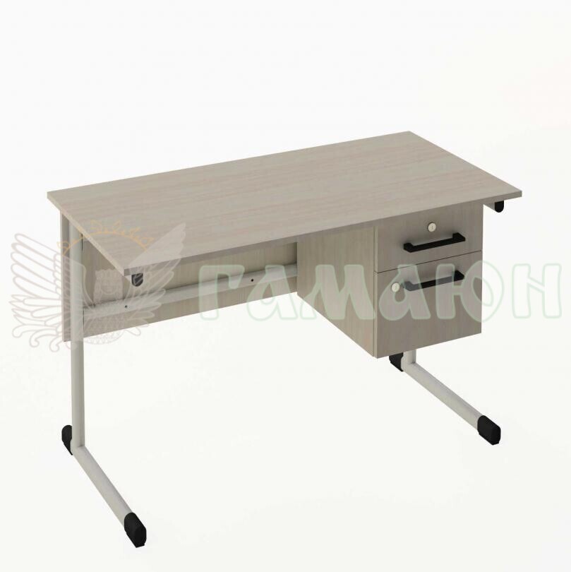 Стіл складається з стільниці, екрану та підвісної тумби між металевими каркасами. Металеві каркаси з`єднуються за допомогою металевих стяжок. Тумба має полицю закриту дверима та шухляду на кулькових напрямних повного висуву. Шухляда та двері обладнані замками.