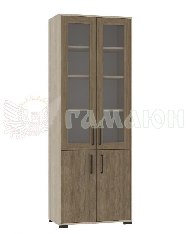Функціональність та переваги: Шафа поєднує відкритість та закритість простору завдяки скляним дверцятам, що створює естетичний ефект напівпрозорості без втрати акуратності. Полицевий простір дозволяє раціонально організувати предмети різного формату. Стриманий дизайн і продумана палітра кольорів сприяють гармонійному поєднанню з іншими меблями у приміщенні. Виріб забезпечує зручність у щоденній експлуатації та візуальну легкість інтер’єру.
