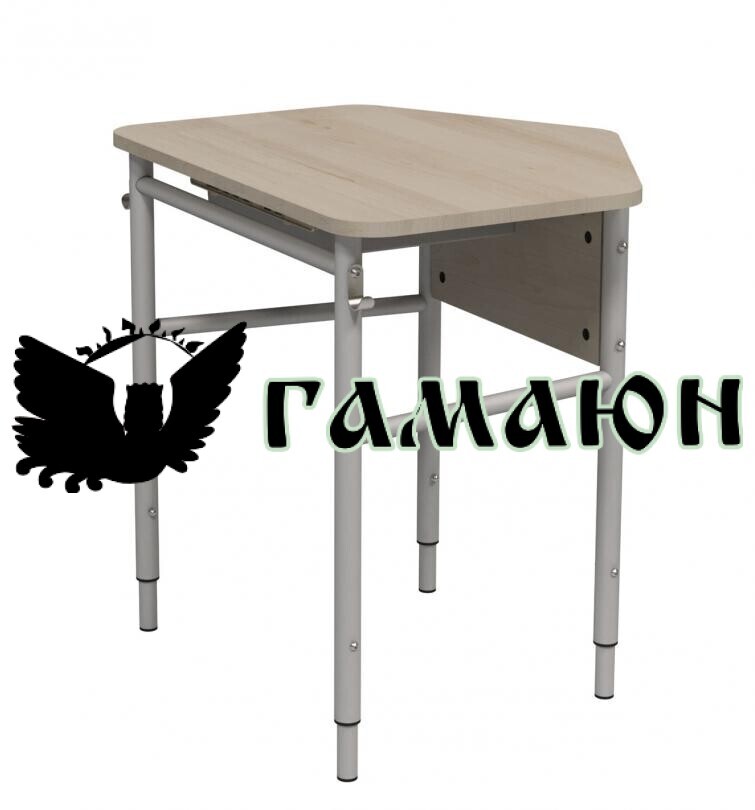 Опис виробу: Стіл призначений для облаштування індивідуального робочого місця учня в освітніх закладах. Конструкція передбачає ергономічну стільницю з округленими кутами з усіх сторін, екран для зонування та бокові гачки для розміщення портфеля чи особистих речей. Каркас дозволяє регулювання висоти у чотирьох положеннях відповідно до ростових груп №4–7, забезпечуючи анатомічно правильну посадку.