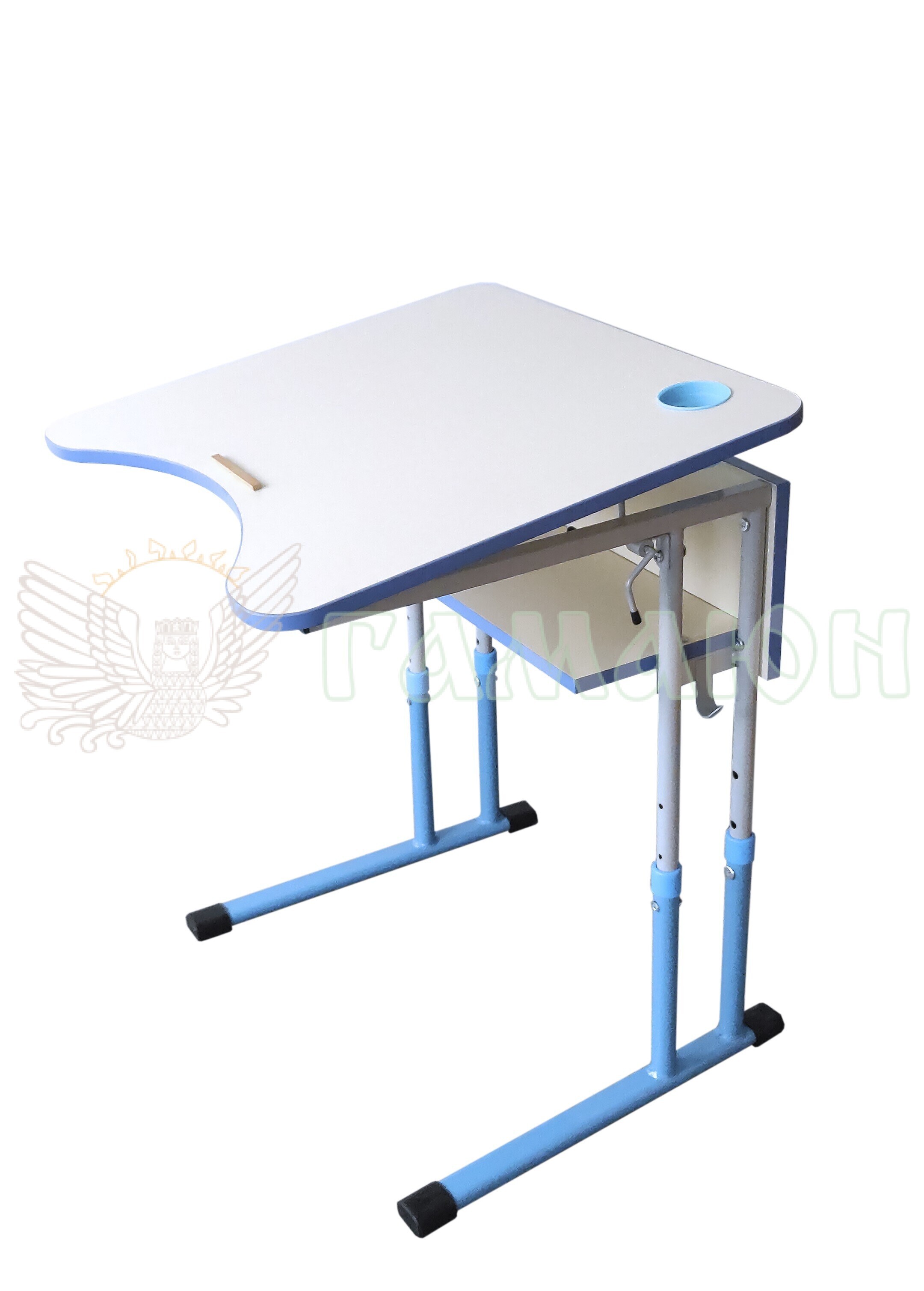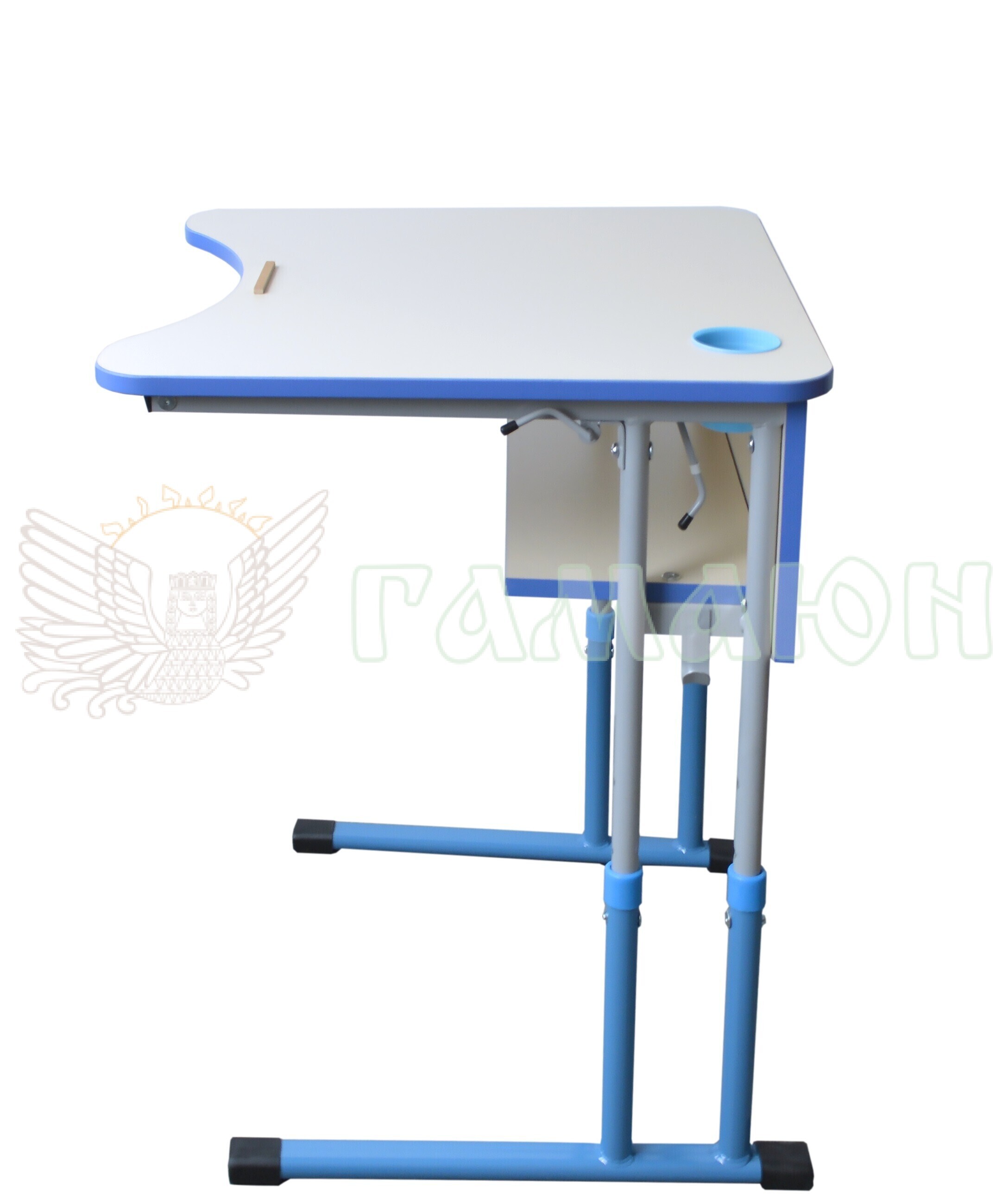 За рахунок поворотних елементів стільниця може займати три положення – горизонтальне та похиле 7 та 16°. Всі кути стільниці – заокруглені. Стільниця личкується кромкою ПВХ товщиною 2 мм, інші деталі – крайкою ПВХ товщиною 0,5 мм. Стільниця має стаканчик та пенал для письмового приладдя. З боку, ближнього до учня, на стільниці встановлено засіб для запобігання скочуванню навчального приладдя та зошитів. Стільниця зі сторони учня має спеціальний антисколіозний виріз. Під стільницею встановлено полицю.