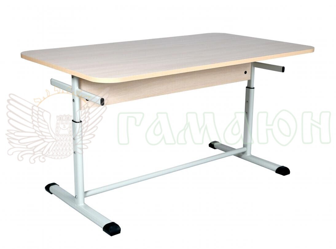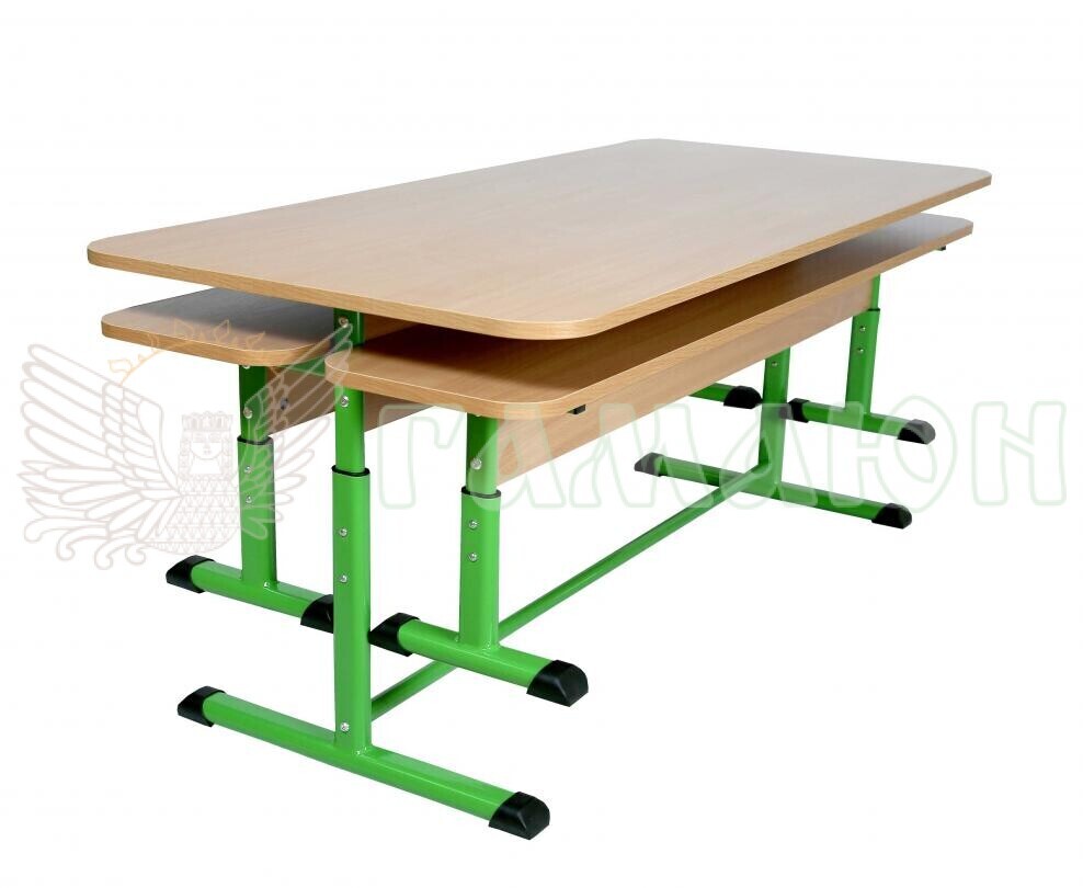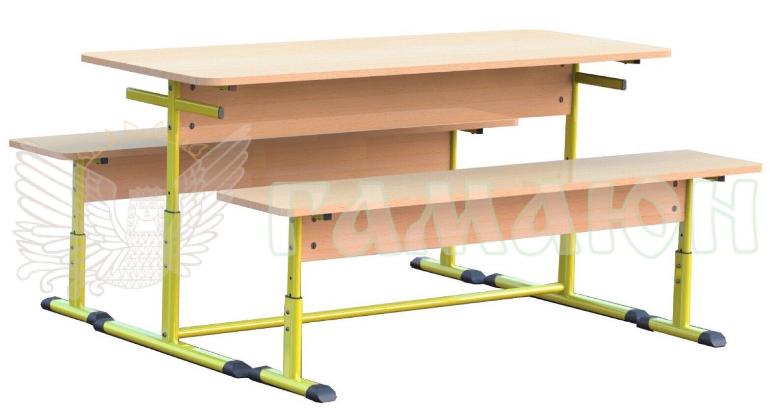 Регулювання висоти столу здійснюється за допомогою гвинтів по отворах каркасу і ніжки, між якими встановлена пластикова перехідна втулка. На торцях каркасу закріплені пластикові наконечники, які запобігають травмуванню учнів та пошкодженню підлоги.