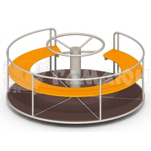 Карусель призначена для активних ігор дітей у віці від 3 до 12 років. Складається з металевого каркасу, до сталевих труб надійно прикріплена лави по всьому діаметру каруселі. В середині знаходиться колесо, за допомогою якого гравці надають рух самій каруселі.