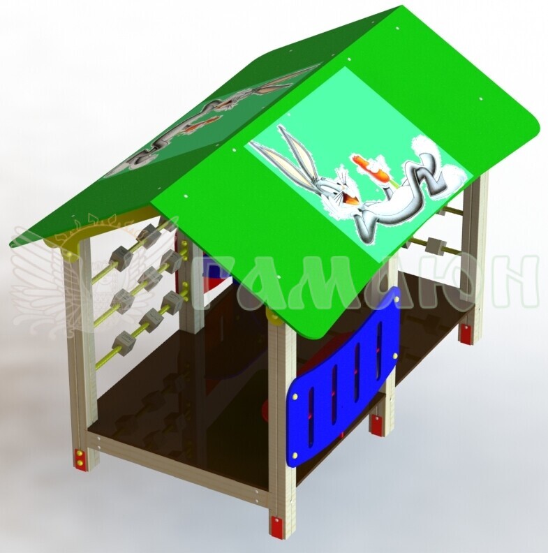 Цей яскравий будиночок - класичний ігровий елемент для дитячого майданчика, улюблений усіма дітьми, який принесе користь і радість вашій дитині. Призначений для дітей віком від 3 до 7 років. Варіант як для приватних будинків, так і для дитячих майданчиків. Усередині будиночка є 2 дерев'яні лавочки, розташовані вздовж стін, що дозволяє дітям відпочивати у перервах між іграми на дитячому майданчику. Має двосхилий фанерний дах, який чудово захищає дітей від променів сонця, а разом з фанерними стінами — і від дощу, що мрячить, і вітру. Головною особливістю будиночка «Кролик Роджер» є два рахунки, розташовані замість двох стін. Будиночок «Кролик Роджер» стоїть на 4-х дерев'яних ніжках, завдяки чому можна регулювати висоту підлоги (встановити на дитячий майданчик або закопати ніжки в землю). Виробник завжди дбає про безпеку маленьких користувачів, тому всі матеріали лише з високоякісних матеріалів, металевих та дерев'яних компонентів. Будиночок покритий високоякісною емаллю найкращих європейських виробників. Металеві елементи покриті порошковими фарбами стійкими до погодних умов.