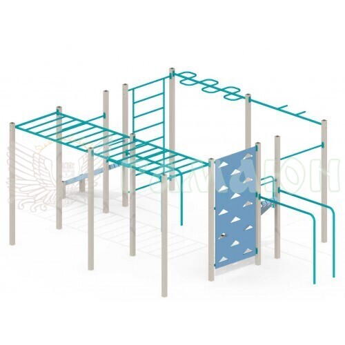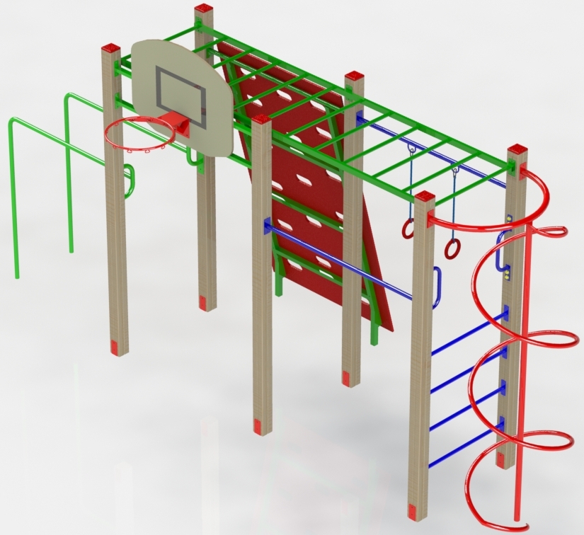 Складається з: Турнік 3 шт., Сітка 1 к-т., Змійка 1 шт., Бруси 2 шт., Дошка для лазання 1 шт., Лавка для преса 2 шт., Упор 1 шт., Рукохід 1 шт.